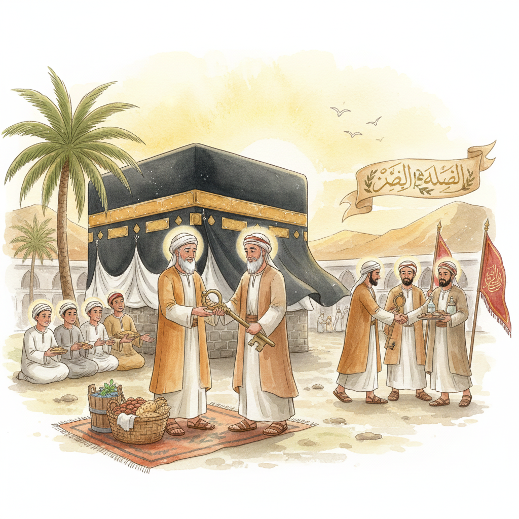 Qusayy was blessed with three sons named Abd al-Uzza, Abd Manaf, and Abd al-Dar. As the years went by and Qusayy grew older, he decided it was time to share his important work with his sons, Abd Manaf and Abd al-Dar. He gave Abd al-Dar a very special job called the hijabah. This meant he was the one to take care of the Kabah and keep its keys safe. But that wasn’t all! Qusayy also asked him to look after the siqayah, the liwa’, and the rifadah. These big words simply mean that he was in charge of giving cool water and tasty food to the traveling pilgrims, and he also carried the special flag of Makkah if there was ever a time of war.